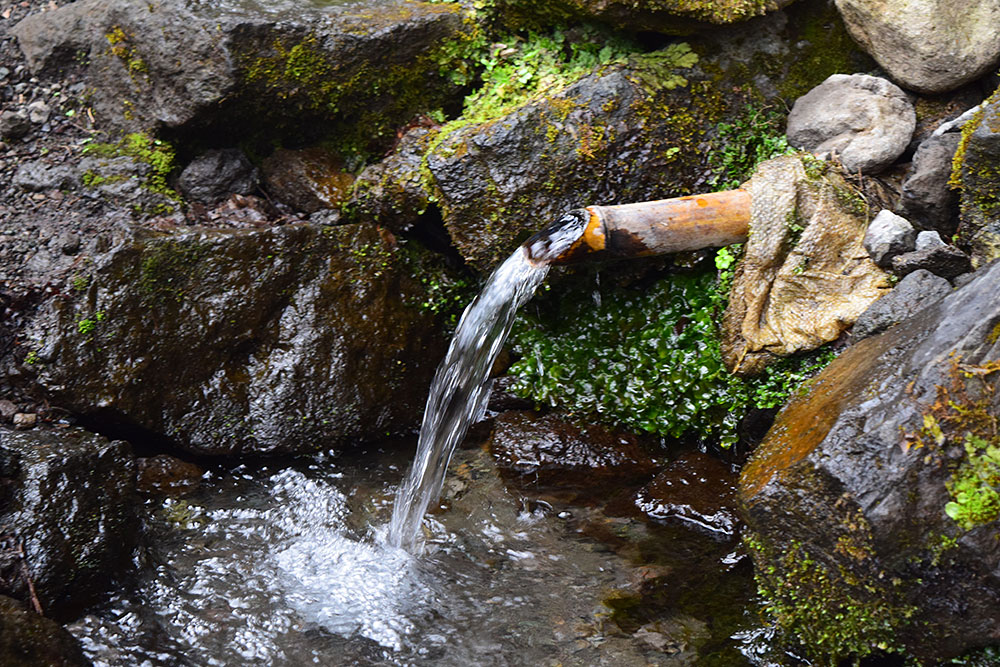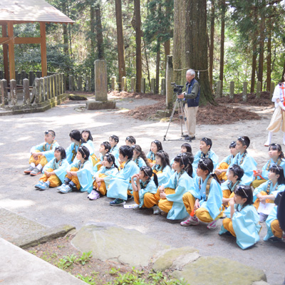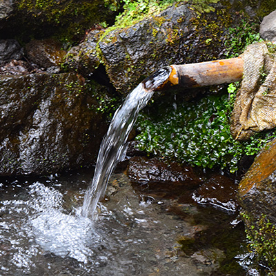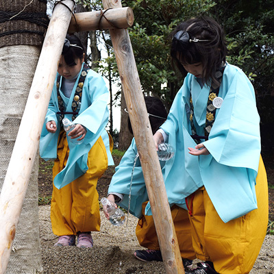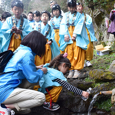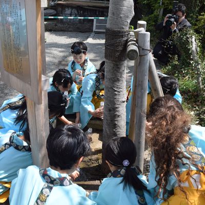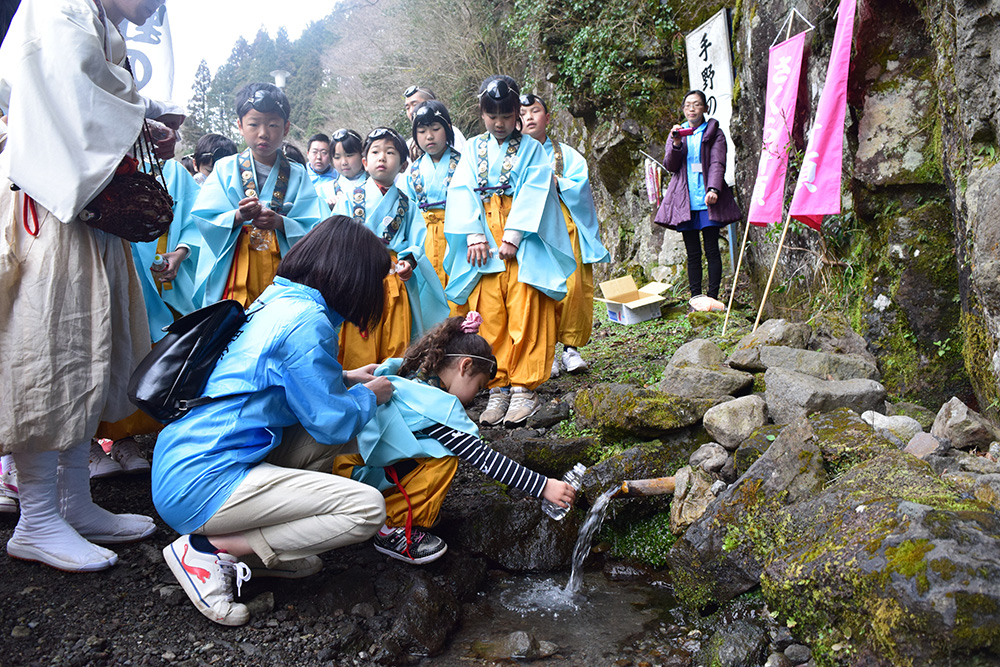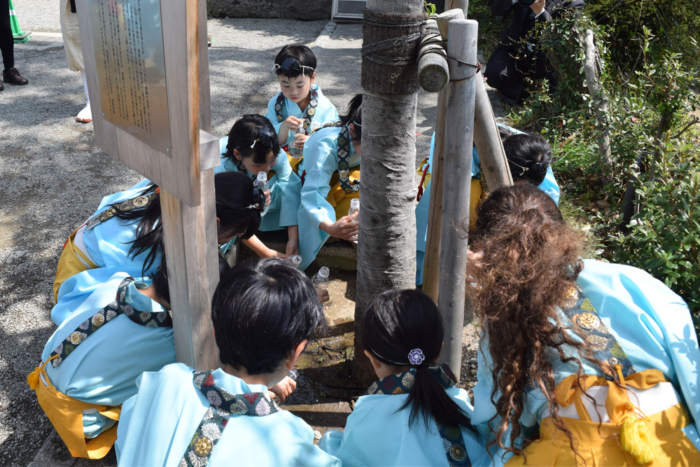 国造神社奥の「手野の名水」を洒水(水やり)し、復興への祈りを捧げます。