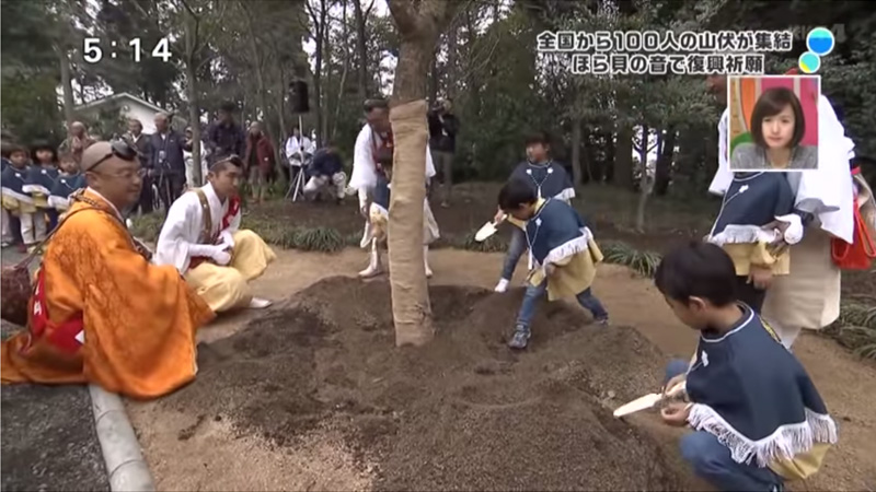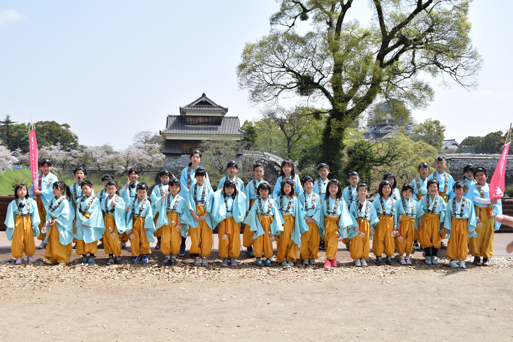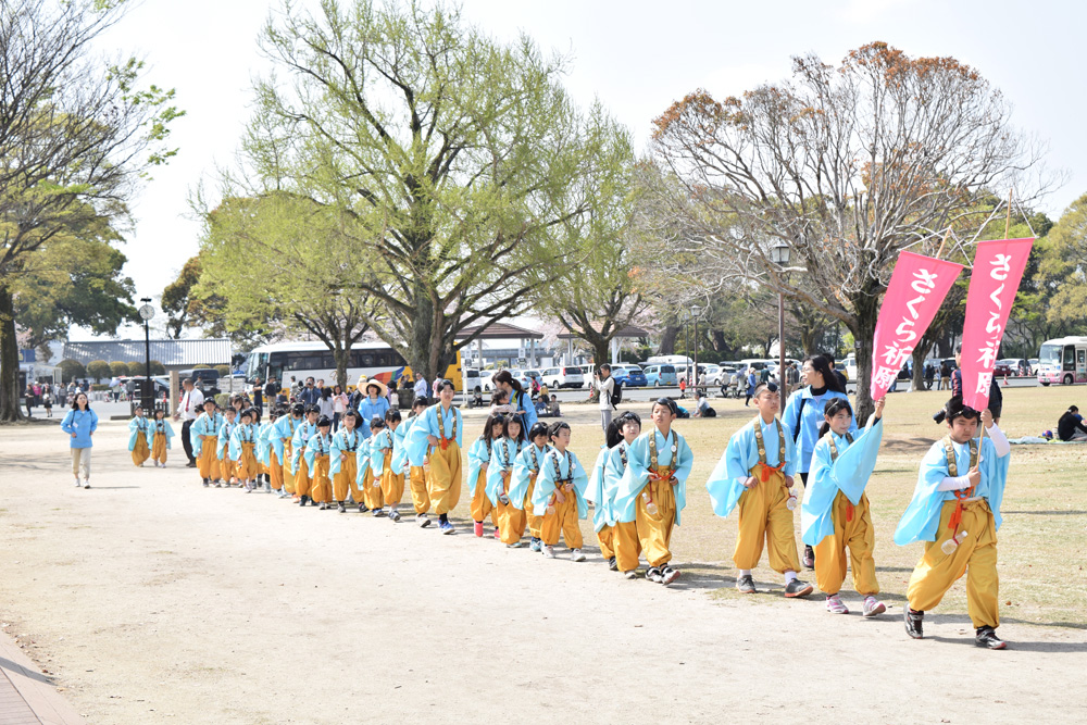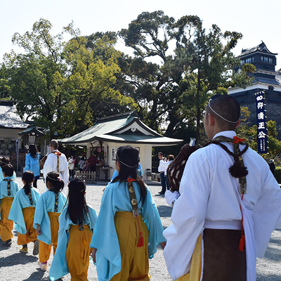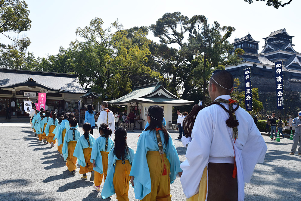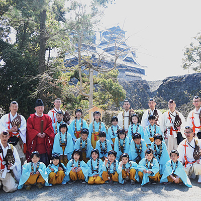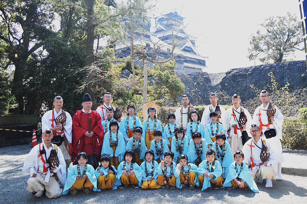 平成二十八年四月に起こった熊本地震の鎮魂と復興を祈るため、醍醐寺を中心とした全国の当山派修験者総勢100余名が加藤神社・阿蘇神社に集結し、百丁の法螺貝を立て、寺院と神社が手をとり「百螺祈願」なる祈りを厳修しました。その際、加藤清正公のご縁を受けて植樹されたのがこの「醍醐の桜」です。本年も時代を超え、熊本復興の新たなシンボルとして、この地に醍醐の桜が咲き誇ります。