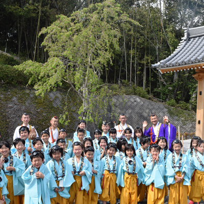 この桜は、豊臣秀吉公が晩年「醍醐の花見」をしたことで有名な京都総本山醍醐寺の桜の子孫で、樹齢約百六十年と言われている「太閤しだれ桜」をクローン技術で現代に蘇らせた桜です。